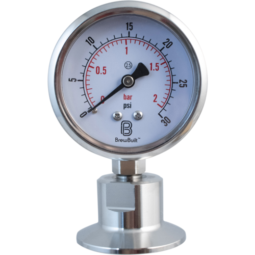 This 1.5" tri-clamp pressure gauge is included with the BrewBuilt™ Kit for Fermenting Under Pressure but can be used with any stainless steel conical fermenter with 1.5" T.C. ports. Liquid filled gauges offer better performance and longer lifespan compared to dry gauges. Dial face reads in both psi and BAR.